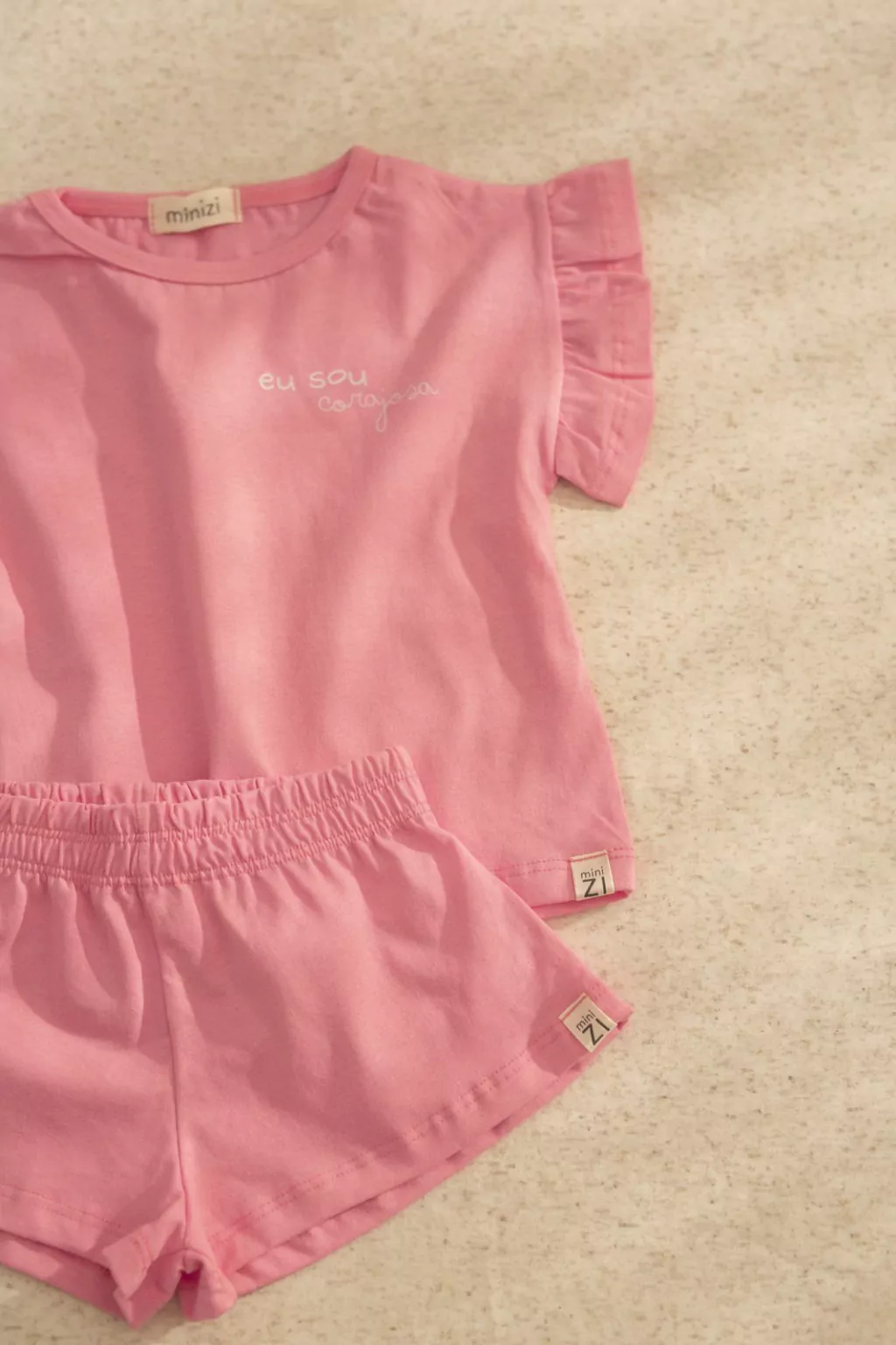 Nosso conjunto "Eu Sou Corajosa", confeccionado em malha penteada, oferece suavidade e durabilidade, ideal para o dia a dia. Com babados delicados nas mangas e uma estampa que transmite positividade, este conjunto é perfeito para destacar a essência do cuidado e da proteção. Um item essencial que certamente encantará mães e filhas em busca de peças especiais e significativas.